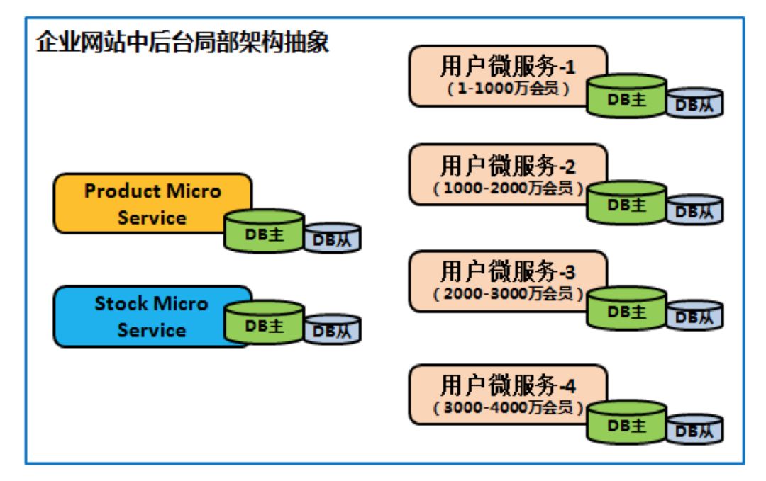 因此我们按照最优的设计会保证单表数据不要超过2000万条,此时我们就会去做表的业务垂直折分,于是就有了微服务,它就会折成这样的架构。我们可以看到每一个数据库与服务都会折开甚至同一个会员也会折成每1000万数据一个库对应着一个微服务实例。