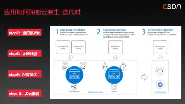 第七步,应用标准化。在经过标准化构建和运行容器承载之后,应用与应用之间只有细微的差异跟资源不同,配置不同,规模化管理所有的应用服务和服务治理,依赖拓扑等等。