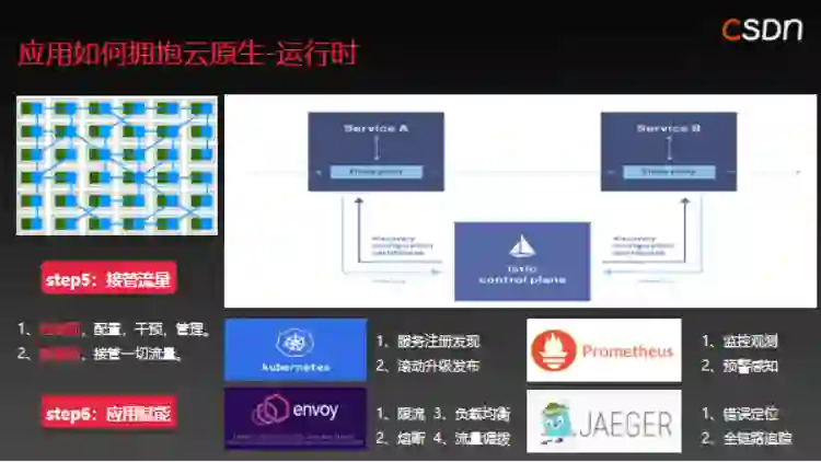 第六步,应用赋能,应用接入后,可在云原生环境里享受更多云所带来的红利。如服务注册发现,滚动升级,限流、熔断、负载均衡,监控预警,全链路追踪等等能力。