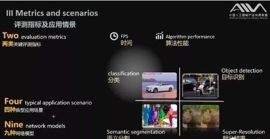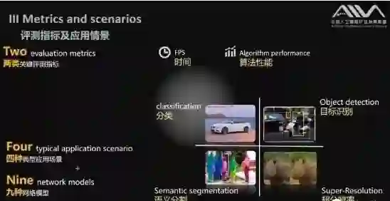 孙明俊表示,首轮评估包含四大典型场景(见图3)和两大类评测指标,指标包含速度(fps)和算法性能,如top1 、top5、mAP、mIoU、PSNR等。值得一提的是,这是深度学习处理器领域首次区分整型和浮点对比的Benchmark。