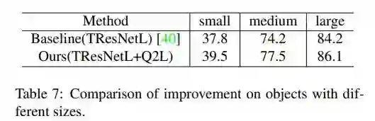 由于不同目标在图中的尺寸不同,本文进行了更详细的实验对比,将小于32x32的目标视为小目标,小于96x96之间的为中目标,大于的为大目标,与Baseline相比在所有尺度上均有优势。