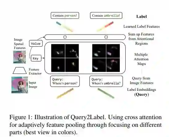 首先框架上,Query2Label是一个两阶段框架,第一阶段将图片通过一个骨干网络提取特征图,第二阶段将图片特征和标签特征一起送入Transformer解码器中,图片特征作为key和value,标签特征作为query,将Transformer输出的query特征经过自适应特征池化和线性投影后预测标签存在性。