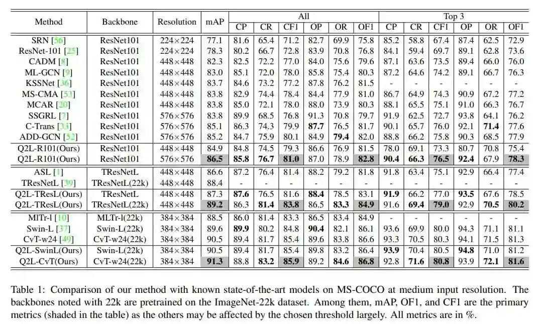 ASL作为上一个SOTA,采用的Backbone是TResNetL,为了跟ASL的结果进行公平对比,本文也基于TResNetL进行了实验。由于Backbone可以随意替换,本文又实验了其他更强的Backbone,在MS-COCO数据集上结果如下: