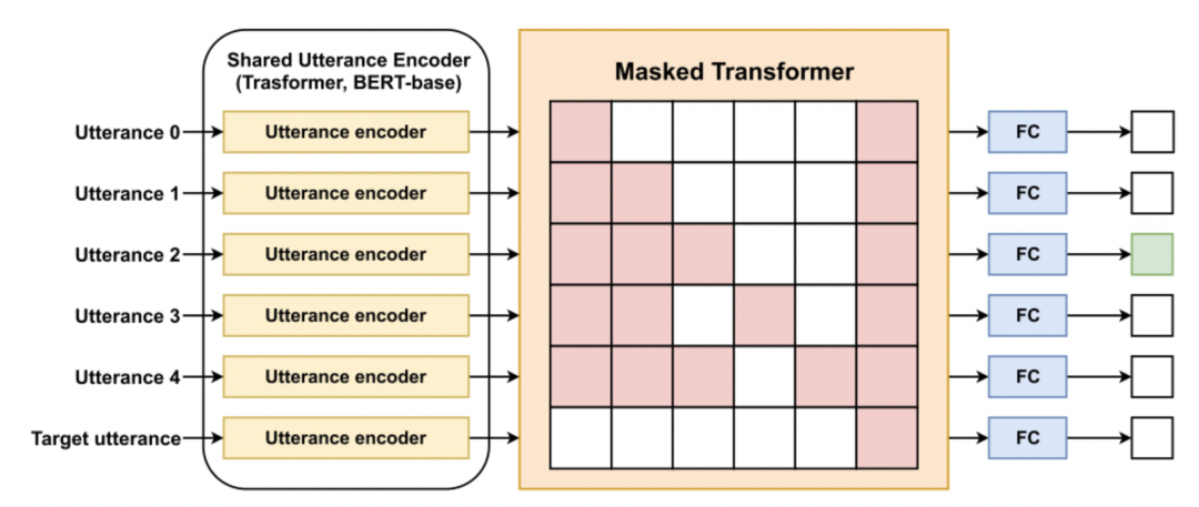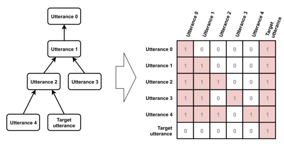 (Zhu et al. 2019[11])提出了使用Masked Hierarchical Transformer(MHT)来解决该任务。如图 8a 所示,MHT 主要包括 Utterance encoder、Masked Transformer 和 Output Layer 三个部分。Utterance encoder直接使用 Bert 预训练模型参数初始化,对utterance进行单词级别编码。Masked Transformer使用 Mask 机制来有效地利用对话的结构特点,对 utterance 进行句子级别的编码。Mask 矩阵构造示例如图 8b 所示,Mask 机制的设计主要遵循以下四点: