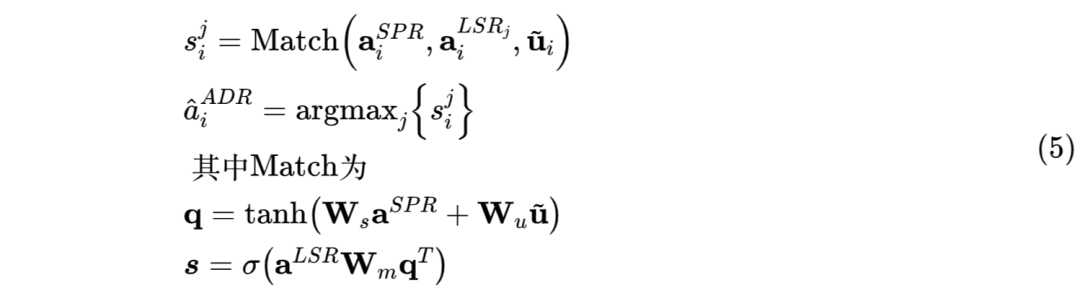 Matching,addressee 识别模块,对于每一轮的 addressee 计算如公式(5)所示,将当前 speaker 向量和 utterance 向量通过非线性融合得到 query,将 query 与每个 listener 做 bilinear 变换后使用 softmax,得到每个 listener 作为 addressee 的概率。