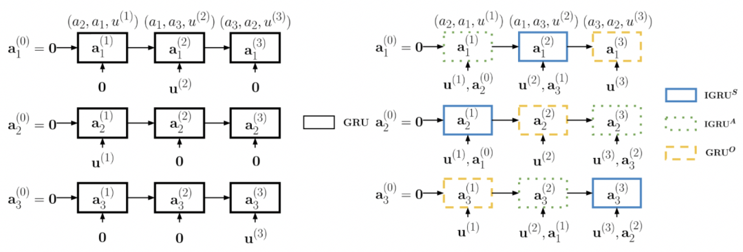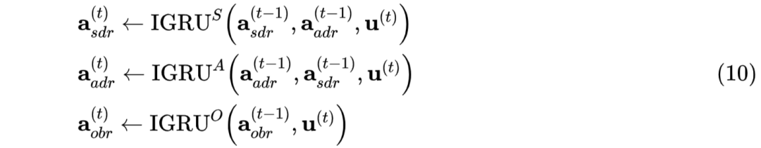 (R. Zhang et al. 2018[6])基于 Dynamic RNN 提出了 SI-RNN 模型(Speaker-Interaction RNN)。SI-RNN 使用角色敏感的 speaker 向量更新方式,即每一轮对话时,不同角色(sender,addressee,observer)使用不同的 GRU 单元进行更新,多轮对话更新过程如图15右所示,更新操作可使用公式(10)描述: