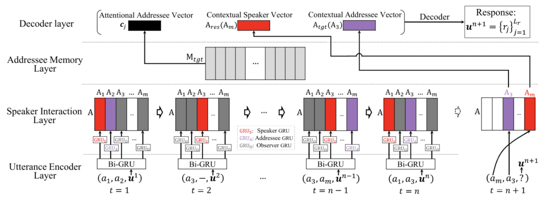 Speaker Interaction Layer,维护一个说话人(speaker)向量矩阵,在每一轮对话时,基于参与者的角色(speaker,addressee,observer),分别使用三种 GRU 更新其 speaker 向量。