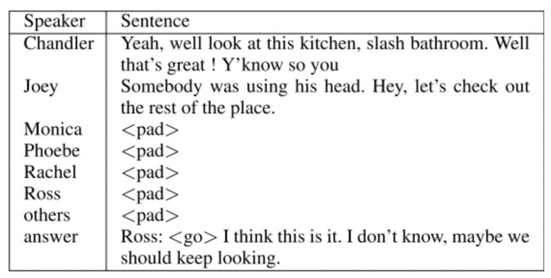 (Yang et al. 2019[10])提取了老友记中六个主要角色(Monica, Joey, Chandler, Phoebe, Rachel, and Ross)的对话进行多方对话的回复生成任务。论文中为了方便使用RNN对各个角色进行建模,将所有角色的对话按顺序进行了排列,如图7所示(其中