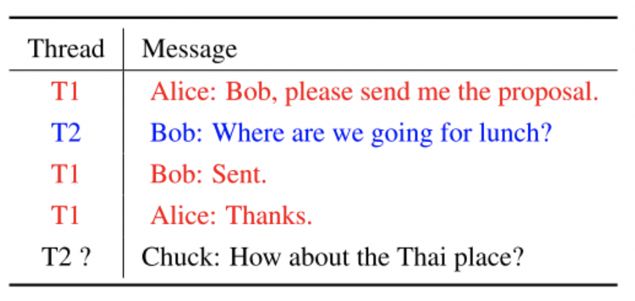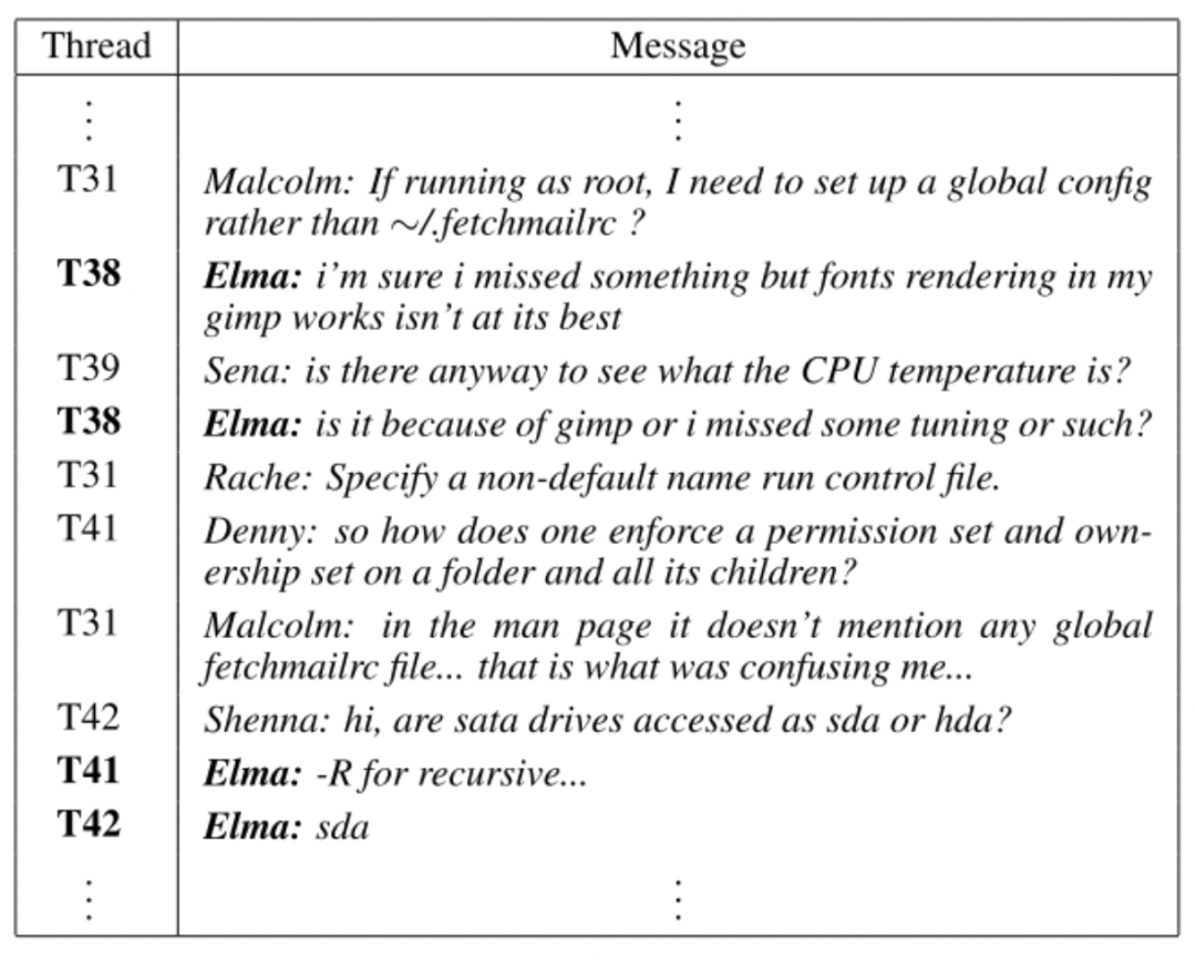 [4]Kummerfeld, Jonathan K. et al. A Large-Scale Corpus for Conversation Disentanglement. 2019.