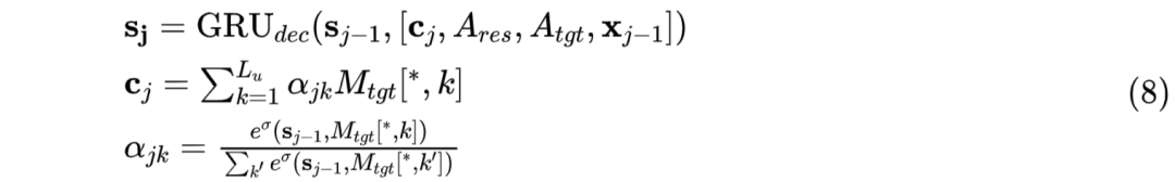 Decoder Layer,该部分使用 GRU 进行回复生成,其中使用了注意力机制,并融入当前 speaker 和 addressee 向量,如公式(8)所示,其中