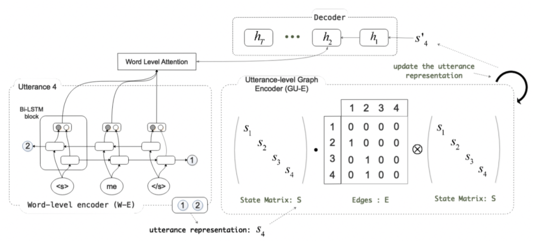 Initialization,对话语(utterance)和说话人(user 或 speaker)状态进行编码。Utterance Initialization Encoder 使用 Hierarchical RNN 进行句子编码,即首先使用 BiGRU 对 utterance 进行单词级别编码,然后使用 BiGRU 进行句子级别编码来捕捉上下文信息。Position-Based User Initialization 将对话历史中 speakers 按照首次出现倒序进行排列获得 speaker 向量矩阵 ,并使用零向量初始化。