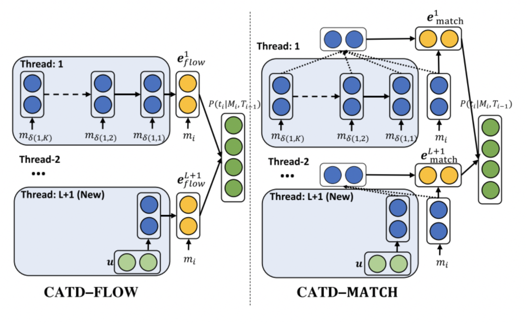(Tan, Wang, and Wang 2019[9]) 提出了Context- Aware Thread Detection (CATD) 来解决该任务(论文中将该任务称为Thread Detection)。CATD主要分为CATD-FLOW和CATD-MATCH两个模型,分布捕捉thread历史上下文信息和thread上下文和输入消息的一致性信息(即相似性)。论文中使用Universal Sentence Encoder(USE)获得每个消息的句子表示,然后使用RNN编码每个thread最近的K个消息作为该thread的向量表示。具体来说: