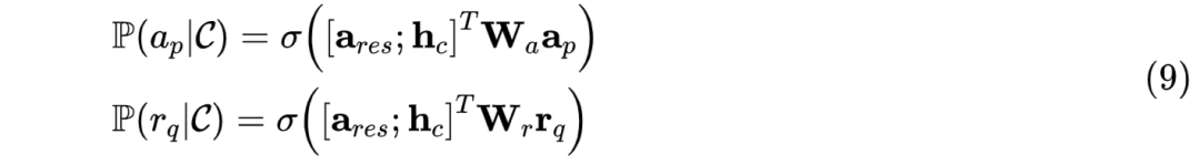 经过双线性变换操作得到最终隐层向量,最后经过 softmax 分类获得作为说话对象和正确回复的概率,如公式(9)所示: