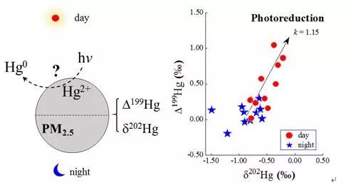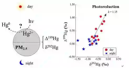 考虑到大气颗粒态汞可能存在昼夜的光化学过程差异,中国科学院地球化学研究所陈玖斌课题组博士黄强利用汞稳定同位素研究了北京大气颗粒态汞的同位素组成昼夜变化。通过定量分析昼、夜PM2.5样品的汞同位素组成,发现颗粒态汞的同位素组成,尤其是非质量分馏具有显著的昼夜交替变化规律(如图右所示),白天样品(day)的非质量分馏Δ199Hg比夜间(night)显著较高。通过样品的地球化学特征和气团轨迹模型分析,结果表明这种昼夜变化不是由源贡献的变化引起的,而更可能是由于颗粒上的二价汞的光化学还原所产生的。该研究的结果表明,除一般认为的昼夜温差变化引起昼夜颗粒态汞的质量浓度变化外,大气颗粒态汞发生的光化还原过程,也可导致颗粒态汞的质量浓度昼夜变化,该过程产生的气态单质汞,也可能是大气中气态单质汞的一个贡献端元,颗粒态汞与气态汞的转化过程还有待深入研究。