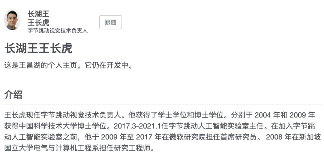 王长虎曾任字节跳动AI Lab总监一职,主要研究计算机视觉,视频理解和机器学习。