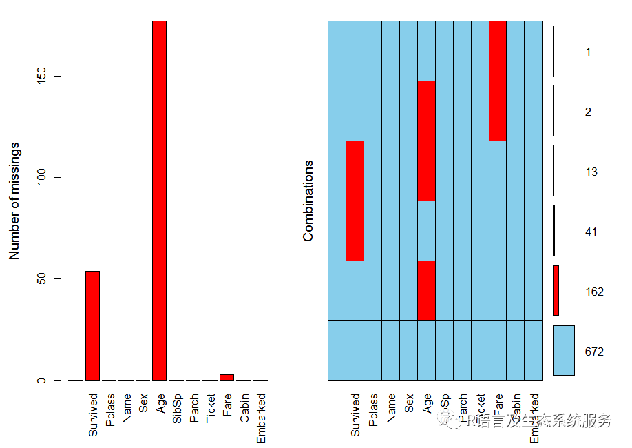 ##查看数据的缺失情况 library(VIM) aggr(Data,prop=FALSE,number=TRUE)