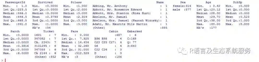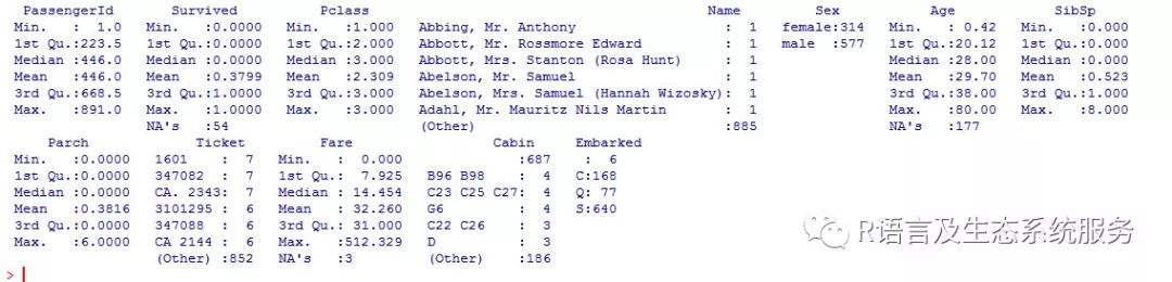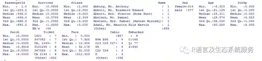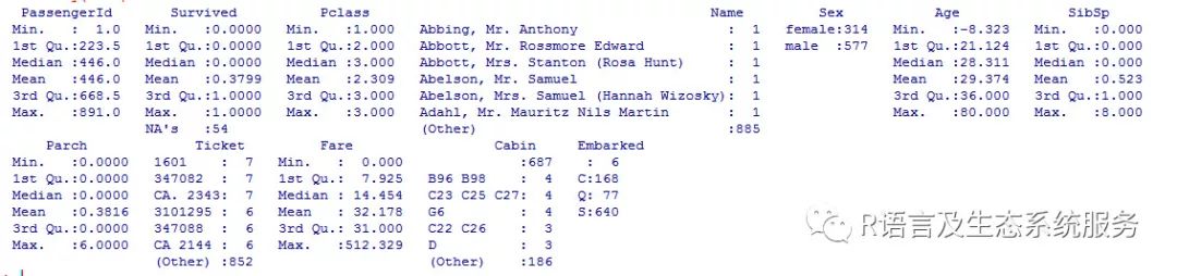 $PassengerID:乘客编号 $Survived:活情况(存活:1,死亡:0) $pclsss:船舱等级 $name:乘客姓名 $sex:乘客性别 $age:乘客年龄 $sibsp:同程的兄弟姐妹/配偶 $parch:同程的父母/小孩 $ticket:船票编号 $fare:船票价格 $cabin:客舱号 $embark:登船地点 ##查看数据情况 Summary(Data)