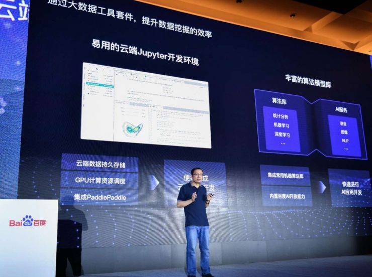 百度大数据部总监郭谢也为在场观众正式介绍百度大数据众智开放平台「点石」,其中包括三个开发工具,Datalab、预置算法库、预制模型库。