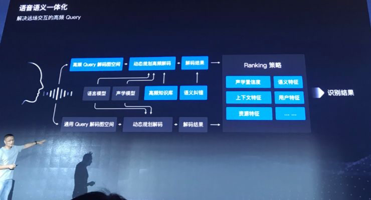 百度语音技术部总监高亮表示,百度目前在远场语音语义上有三个最新技术突破,一是语音语义一体化,二是多语种混合声学建模,三是将传统拼接技术与 WaveNet 融合。他表示,语音语义一体化将远场交互中高频 Query 识别准确率提升 10 个点,并保持普通 Query 识别率不降。他也具体介绍了如何解决远场交互的高频 Query,可以看到其中涉及到语言模型、声学模型、高频知识库、语义纠错等多个方面。