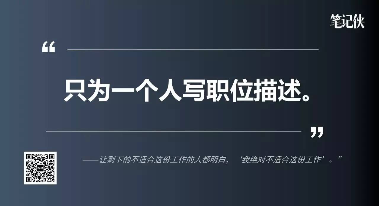 “我又收到了一条相反的建议:只为一个人写职位描述,也就是说,只让那个 100% 的人看了职位描述后想要来应聘就够了。让剩下的不适合这份工作的人都明白,‘我绝对不适合这份工作’。”