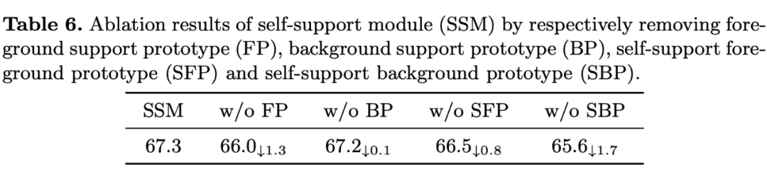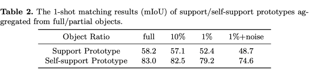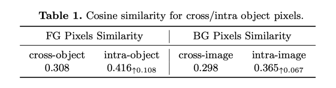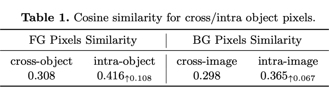 如表 1 所示,对于前景像素来说,相同物体上的前景像素之间的相似度远大于不同物体上的前景像素之间的相似度。我们在背景像素上也观察到相同的现象。但是这里验证的是像素之间的关系,而我们的目的是进行特征原型 support prototype 和查询图片特征 query feature 之间的匹配。所以我们利用另一个实验进一步验证我们的自支持想法。