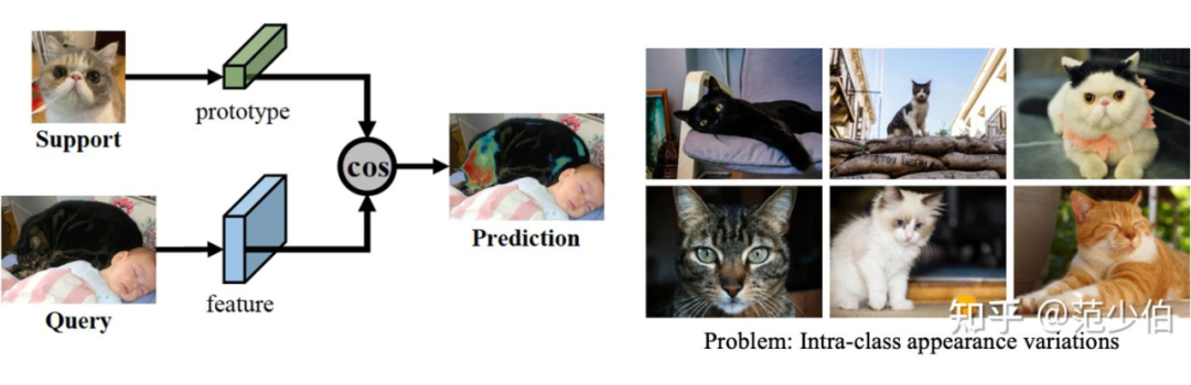 小样本分割任务存在一个非常重要的问题,就是 support 和 query 间的 appearance gap。在 support 和 query 中的同类别物体可能存在非常大的外观差异性。比如同样是猫这个类别,但是不同的猫的品种、姿态和拍照的光照条件等可能完全不一样,如图 0 右图所示。这一问题源自于小样本任务的特性,即数据稀少性和数据多样性。