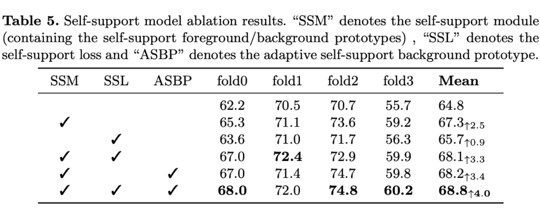 个优点是自支持算法会更加受益于更好的 backbone 和 support 数量,因为它们可以带来更准确的初始 query mask 预测结果,可以提取更准确的 self-support prototype,进而得到更好的分割结果。这是一种马太效应,因此我们的方法在 ResNet-101 backbone 和 5-shot support 的设置下会大大优于其他的算法。同时表 8 也展示了自支持算法在不同条件下的性能提升幅度。
