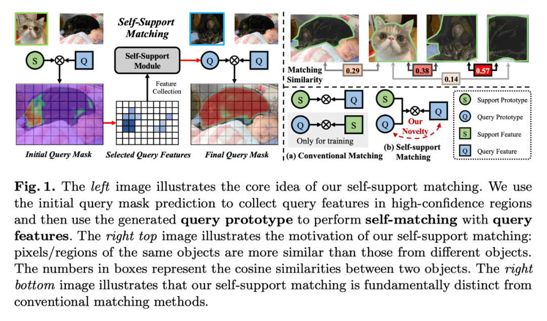 得到的,而 query prediction mask 则是由传统 support-query 匹配算法生成的。因为这种 query 特征的自匹配性质,我们将方法命名为自支持(self-support)算法。