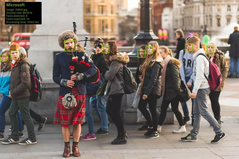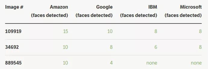 亚马逊能够在这张图片中检测到 10 张面孔,而谷歌只发现了 4 张,IBM 检测到 0 张以及微软检测到 0 张。