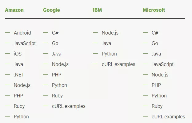 因为我最熟悉 PHP,所以我决定在这次测试中坚持使用 PHP。我想指出每个供应商提供了什么样的 SDK(截至今天):