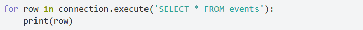 你经常可以看到示例代码中,作者在select语句的结果上使用fetchone或者fetchall操作。但是我发现,最自然的查看结果的方式是直接在游标上进行遍历: