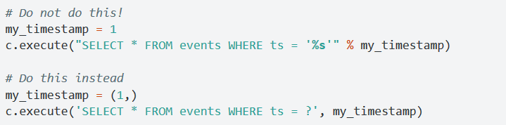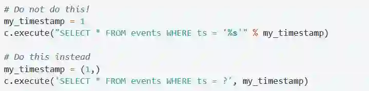 你可能倾向于使用Python字符串操作来向SQL中插入值,不要那样做!那样很不安全,Sqlite3提供了一个更安全的办法:占位符。