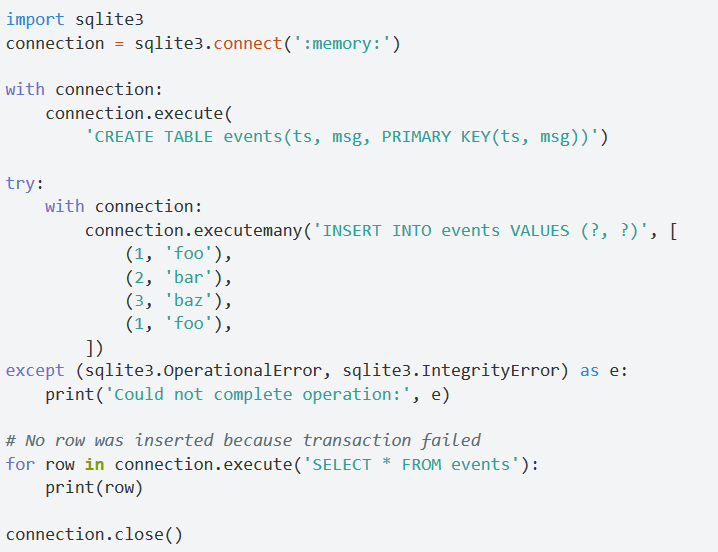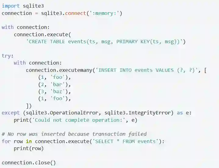 异常是会不时发生的,即便你定义了一个事务,在事务运行过程中也可能会发生异常。为了避免你不得不手动地进行commit和rollback,你可以把连接对象作为一个上下文管理器。在下面的例子中,我们创建了一张表,然后插入了一些错误的数据,因为这些数据的主键上有重复的值。