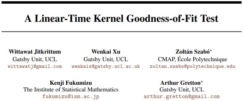 来自伦敦大学学院(UCL)的 Wittawat Jitkrittum 等人同时获得了 NIPS 2017 最佳论文奖。