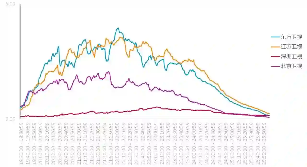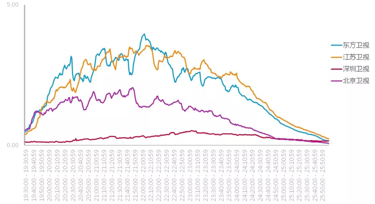2016年12月31日四大卫视跨年晚会直播分钟收视率曲线(尼尔森)