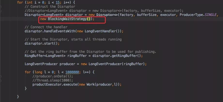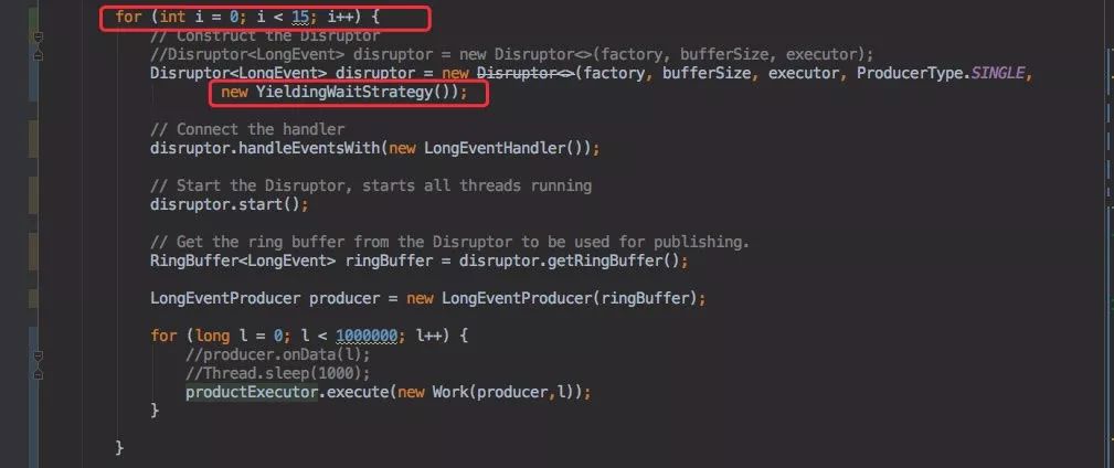 创建了 15 个 Disruptor 队列,同时每个队列都用线程池来往 Disruptor 队列里面发送 100W 条数据。