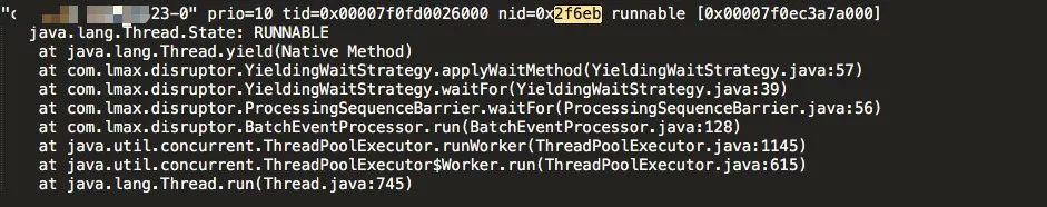也就是说都是 Disruptor 队列的堆栈,同时都在执行 java.lang.Thread.yield 函数。