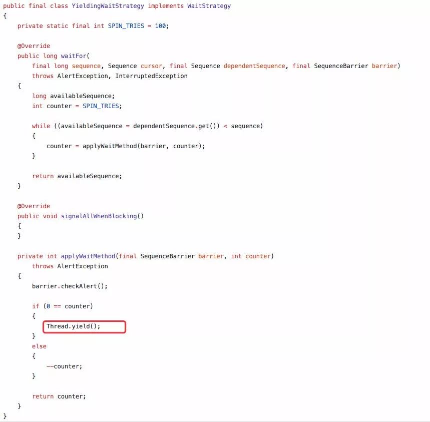 YieldingWaitStrategy 是一种充分压榨 CPU 的策略,使用自旋 + yield 的方式来提高性能。
