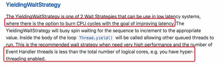 但留意到官方对 YieldingWaitStrategy 的描述里谈到:当消费线程(Event Handler threads)的数量小于 CPU 核心数时推荐使用该策略。