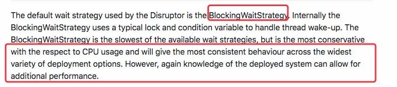 同时查阅到其他的等待策略 BlockingWaitStrategy (也是默认的策略),它使用的是锁的机制,对 CPU 的使用率不高。