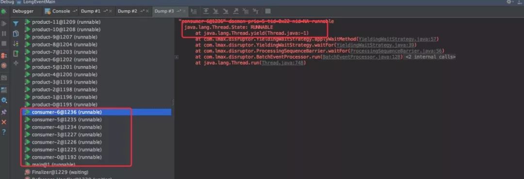 同时 Dump 线程发现和生产的现象也是一致的:消费线程都处于 Runnable 状态,同时都在执行 yield。