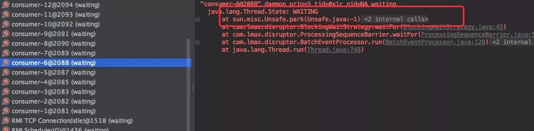 发现这是 Disruptor 的一个堆栈,前段时间正好解决过一个由于 Disruptor 队列引起的一次 OOM,没想到又来一出。