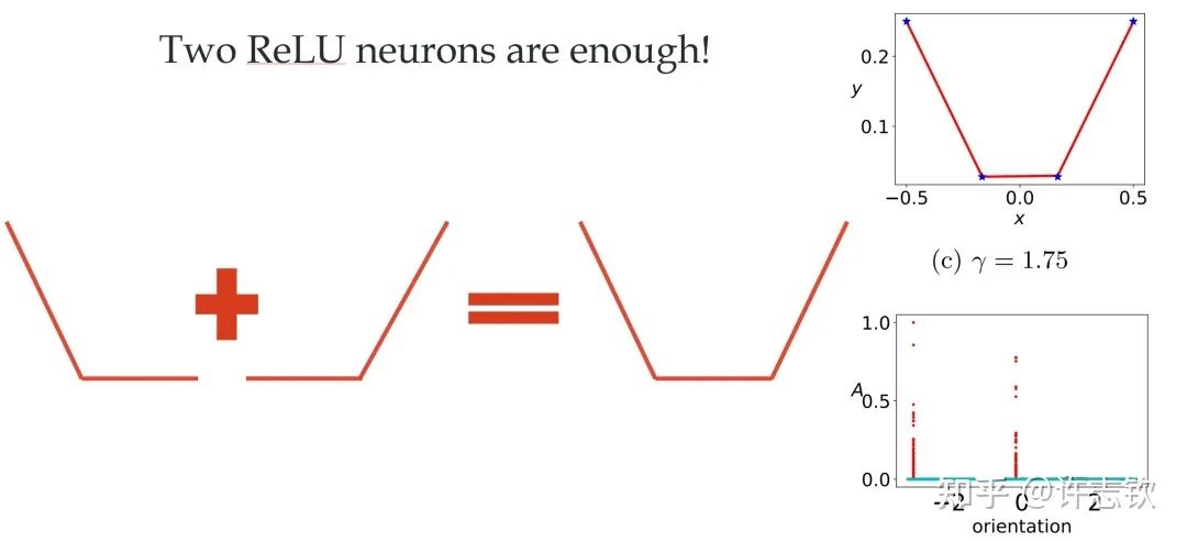回顾在我们前面最开始提到的泛化迷团,以及我们最开始提出的问题“在实际训练中,神经网络真的很复杂吗?”,在参数凝聚的情况下,对于一个表面看起来很多参数的网络,我们自然要问:神经网络实际的有效参数有多少?比如我们前面看到的两层神经网络凝聚在两个方向的例子,实际上,这个网络的有效神经元只有两个。因此凝聚可以根据实际数据拟合的需求来有效地控制模型的复杂度。