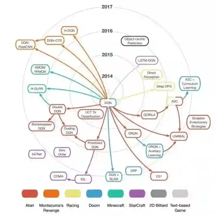 关系 RL。近期学习客体间关系从而进行推理与预测的“关系学习”受到了学界的广泛关注。关系学习往往在训练中构建的状态链,而中间状态与最终的反馈是脱节的。RL 可以将最终的反馈回传给中间状态,实现有效学习,因而成为实现关系学习的最佳方式。2017 年 DeepMind 提出的 VIN[44] 和 Pridictron[23] 均是这方面的代表作。2018 年 6 月,DeepMind 又接连发表了多篇关系学习方向的工作如关系归纳偏置 [45]、关系 RL[46]、关系 RNN[47]、图网络 [48] 和已经在《科学》杂志发表的生成查询网络(Generative Query Network,GQN)[49]。这一系列引人注目的工作将引领关系 RL 的热潮。
