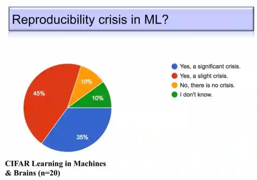 其实,这并非 Precup& Pineau 研究组第一次对 DRL 发难。早在 2 个月前,该研究组就通过充足的实验对造成 DRL 算法难以复现的多个要素加以研究,并将研究成果撰写成文 Reproducibility of Benchmarked Deep Reinforcement Learning Tasks for Continuous Control[9]。同年 8 月,他们在 ICML 2017 上作了题为“Reproducibility of Policy Gradient Methods for Continuous Control”的报告 [10],通过实例详细展示了在复现多个基于策略梯度的算法的过程中,由于种种不确定性因素导致的复现困难。12 月,在万众瞩目的 NIPS 2017 DRL 专题研讨会上,Joelle Pineau 受邀作了题为“Reproducibility of DRL and Beyond”的报告 [11]。报告中,Pineau 先介绍了当前科研领域的“可复现性危机” :在《自然》杂志的一项调查中,90% 的被访者认为“可复现性”问题是科研领域存在的危机,其中,52% 的被访者认为这个问题很严重。在另一项调查中,不同领域的研究者几乎都有很高的比例无法复现他人甚至自己过去的实验。可见“可复现性危机”有多么严峻!Pineau 针对机器学习领域发起的一项调研显示,同样有 90% 的研究者认识到了这个危机。