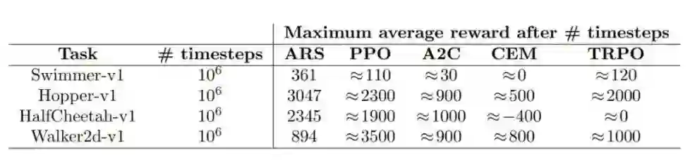 [19] Mania, Horia, Aurelia Guy, and Benjamin Recht. "Simple random search provides a competitive approach to reinforcement learning." arXiv preprint arXiv:1803.07055 (2018).
