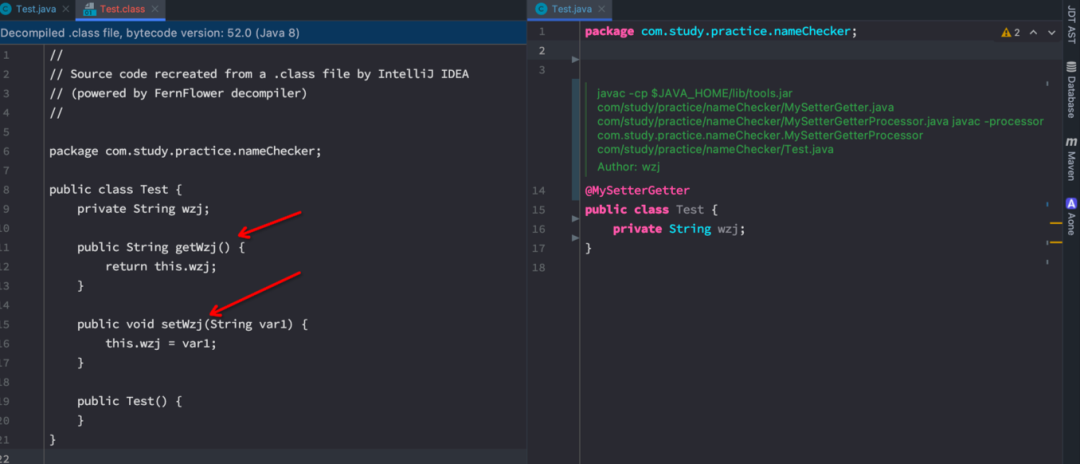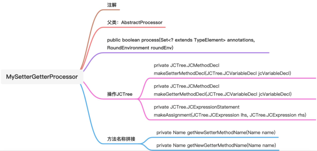 ("com.study.practice.nameChecker.MySetterGetter")(SourceVersion.RELEASE_8)public class MySetterGetterProcessor extends AbstractProcessor {// 主要是输出信息private Messager messager;private JavacTrees javacTrees;private TreeMaker treeMaker;private Names names;public synchronized void init(ProcessingEnvironment processingEnv) {super.init(processingEnv);this.messager = processingEnv.getMessager();this.javacTrees = JavacTrees.instance(processingEnv);Context context = ((JavacProcessingEnvironment)processingEnv).getContext();this.treeMaker = TreeMaker.instance(context);this.names = Names.instance(context);}public boolean process(Set<? extends TypeElement> annotations, RoundEnvironment roundEnv) {// 拿到被注解标注的所有的类Set<? extends Element> elementsAnnotatedWith = roundEnv.getElementsAnnotatedWith(MySetterGetter.class);elementsAnnotatedWith.forEach(element -> {// 得到类的抽象树结构JCTree tree = javacTrees.getTree(element);// 遍历类,对类进行修改tree.accept(new TreeTranslator(){public void visitClassDef(JCTree.JCClassDecl jcClassDecl) {List<JCTree.JCVariableDecl> jcVariableDeclList = List.nil();// 在抽象树中找出所有的变量for(JCTree jcTree: jcClassDecl.defs){if (jcTree.getKind().equals(Tree.Kind.VARIABLE)){JCTree.JCVariableDecl jcVariableDecl = (JCTree.JCVariableDecl)jcTree;jcVariableDeclList = jcVariableDeclList.append(jcVariableDecl);}}// 对于变量进行生成方法的操作for (JCTree.JCVariableDecl jcVariableDecl : jcVariableDeclList) {messager.printMessage(Diagnostic.Kind.NOTE, jcVariableDecl.getName() + " has been processed");jcClassDecl.defs = jcClassDecl.defs.prepend(makeSetterMethodDecl(jcVariableDecl));jcClassDecl.defs = jcClassDecl.defs.prepend(makeGetterMethodDecl(jcVariableDecl));}// 生成返回对象JCTree.JCExpression methodType = treeMaker.Type(new Type.JCVoidType());return treeMaker.MethodDef(treeMaker.Modifiers(Flags.PUBLIC), getNewSetterMethodName(jcVariableDecl.getName()), methodType, List.nil(), parameters, List.nil(), block, null);}/*** 生成 getter 方法* @param jcVariableDecl* @return*/private JCTree.JCMethodDecl makeGetterMethodDecl(JCTree.JCVariableDecl jcVariableDecl){ListBuffer<JCTree.JCStatement> statements = new ListBuffer<>();// 生成表达式JCTree.JCReturn aReturn = treeMaker.Return(treeMaker.Ident(jcVariableDecl.getName()));statements.append(aReturn);JCTree.JCBlock block = treeMaker.Block(0, statements.toList());// 无入参// 生成返回对象JCTree.JCExpression returnType = treeMaker.Type(jcVariableDecl.getType().type);return treeMaker.MethodDef(treeMaker.Modifiers(Flags.PUBLIC), getNewGetterMethodName(jcVariableDecl.getName()), returnType, List.nil(), List.nil(), List.nil(), block, null);}/*** 拼装Setter方法名称字符串* @param name* @return*/private Name getNewSetterMethodName(Name name) {String s = name.toString();return names.fromString("set" + s.substring(0,1).toUpperCase() + s.substring(1, name.length()));}/*** 拼装 Getter 方法名称的字符串* @param name* @return*/private Name getNewGetterMethodName(Name name) {String s = name.toString();return names.fromString("get" + s.substring(0,1).toUpperCase() + s.substring(1, name.length()));}/*** 生成表达式* @param lhs* @param rhs* @return*/private JCTree.JCExpressionStatement makeAssignment(JCTree.JCExpression lhs, JCTree.JCExpression rhs) {return treeMaker.Exec(treeMaker.Assign(lhs, rhs));}}