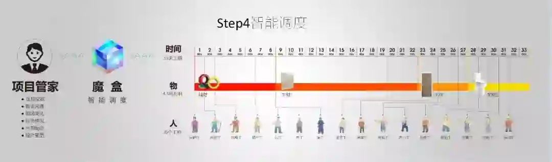 但今天,我们专业的项目管家把信息输入到魔盒,魔盒把一个客户家里要装修三个维度的信息经过一个智能调度,除了上述的不断变化的信息,还有②工人和③材料。