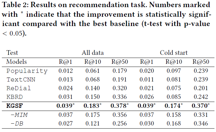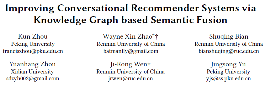 本文将对话系统和推荐系统中基本语义单元分别定义为word和item,使用两个独立的知识图谱来增强两种语义单元的表达。