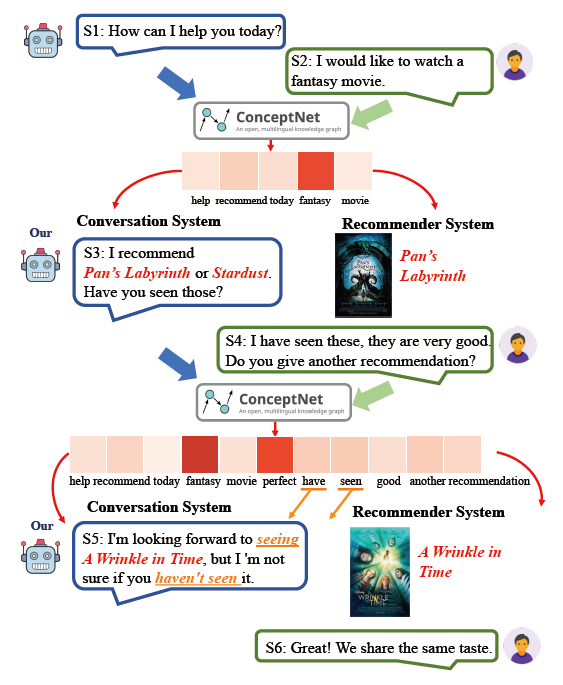 会话推荐系统(conversation recommender system, CRS)旨在通过交互式的会话给用户推荐高质量的商品。通常CRS由寻求商品的user和推荐商品的system组成,通过交互式的会话,user实时表达自己的偏好,system理解user的意图并推荐商品。目前会话推荐系统有两个问题需要解决。首先,对话数据本身缺少足够的上下文信息,无法准确地理解用户的偏好(传统的推荐任务会有历史交互序列或者用户属性,但是该场景下只有对话的记录)。其次,自然语言的表示和商品级的用户偏好之间存在语义鸿沟(在user的话语“Can you recommend me a scary movie like Jaws”中,用户偏好反映在单词”scary“和电影实体”Jaws“上,但这两类信息天然存在语义的差异)。